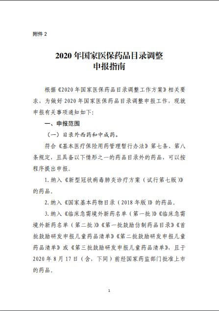 2020年8月3日-10日,國(guó)家醫(yī)療保障局就《2020年國(guó)家醫(yī)保藥品目錄調(diào)整工作方案(征求意見(jiàn)稿)》向社會(huì)公開(kāi)征求了意見(jiàn)。8月17日,《2020年國(guó)家醫(yī)保藥品目錄調(diào)整工作方案》和《2020年國(guó)家醫(yī)保藥品目錄調(diào)整申報(bào)指南》正式公布。